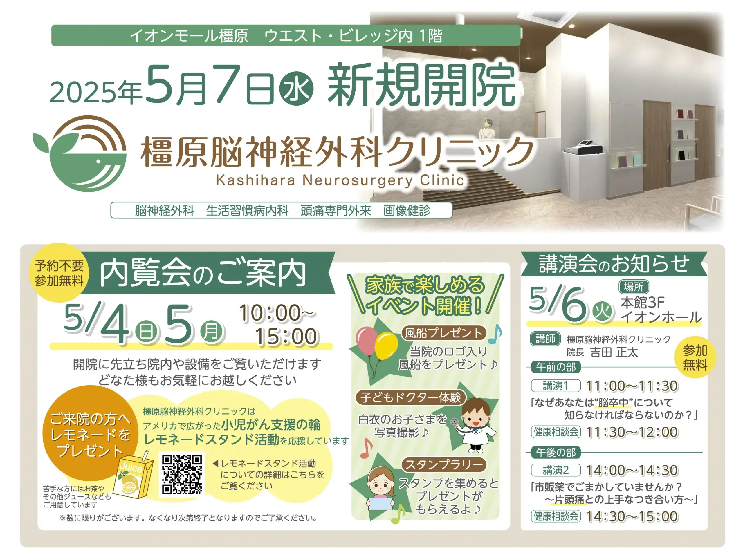 さらに5月6日ははイオンモール本館3階のホールで「脳卒中」および「片頭痛」について30分程度の講演を行います。専門的な用語ではなく、医療現場とは無関係な方向けになるべくわかりやすく解説したいと考えています。