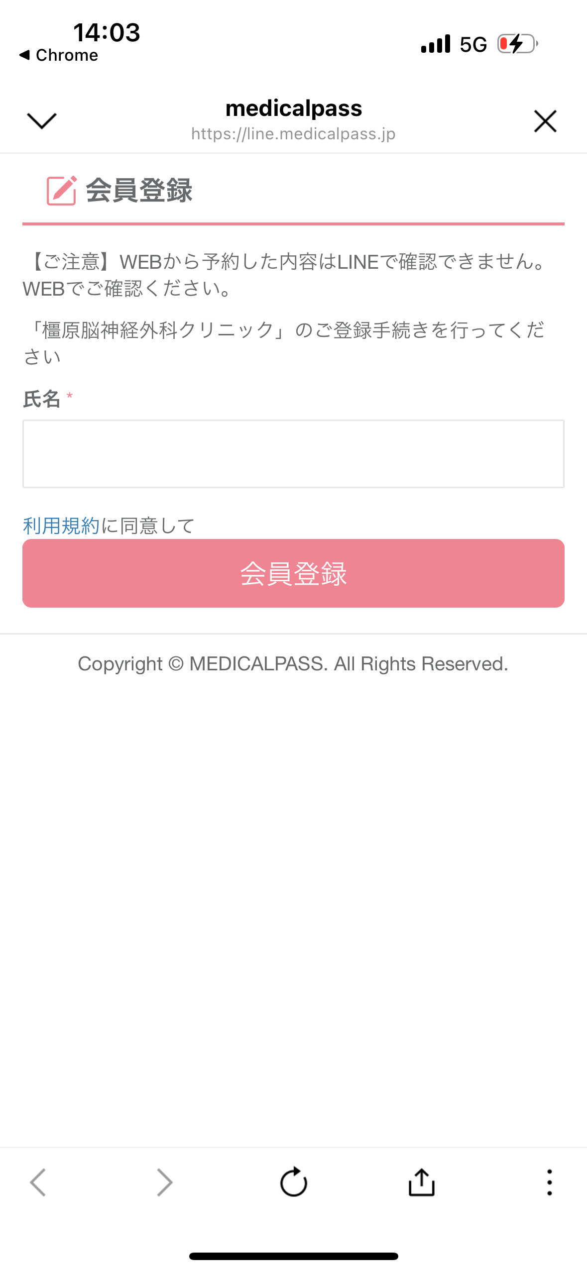 氏名をご記入いただき会員登録が完了となります。 その後は日時や診療内容を決めていただきご予約ください。